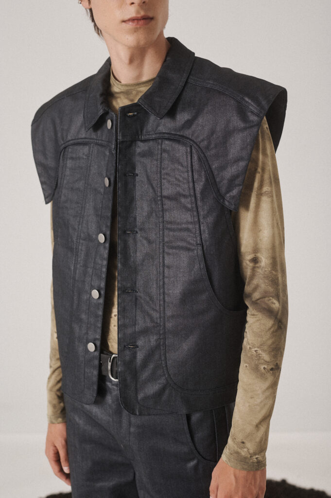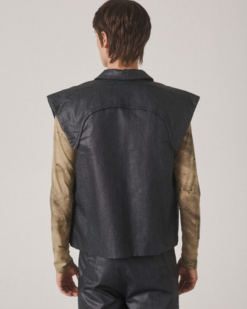 Unisex vest with wide, structured shoulders that create a bold silhouette. It features a button-up front, visible stitching, and side pockets that blend seamlessly into the design.