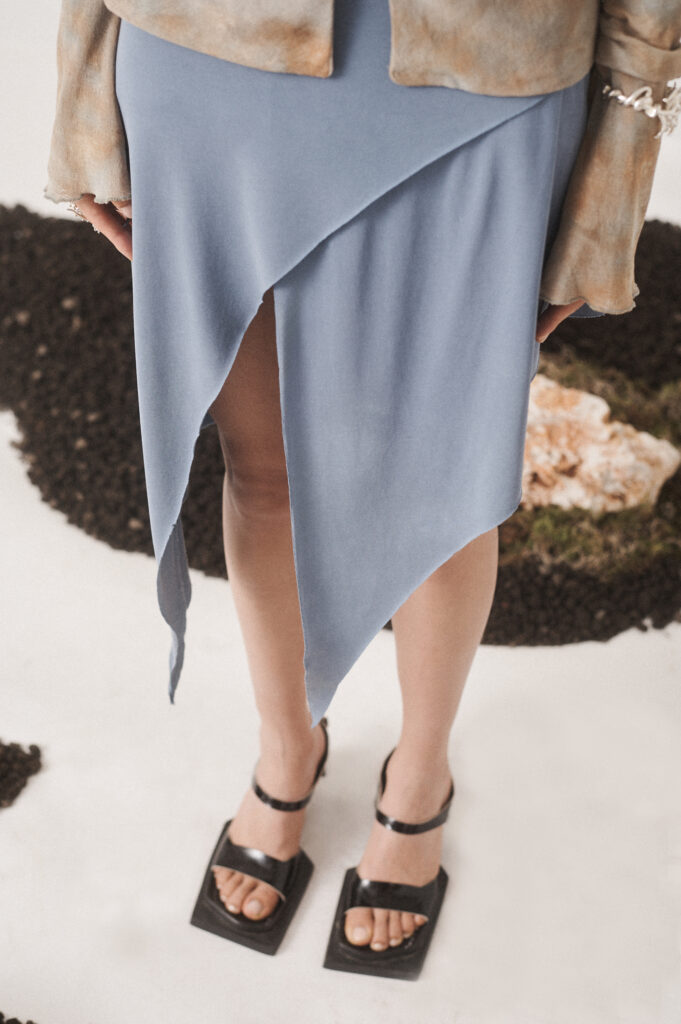 The asymmetrical skirt features draping that enhances movement, giving a scarf style effect.