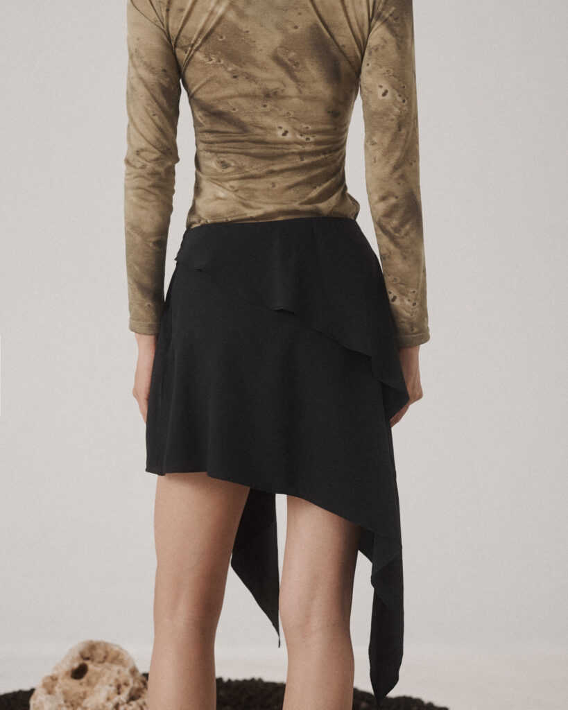 Asymmetrical skirt features fluid draping that enhances movement, giving a soft, flowing effect.